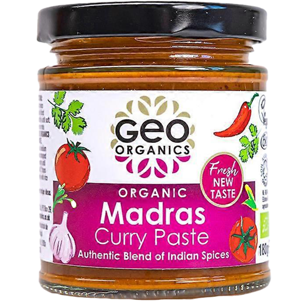 Geo Organics Madras Curry Pasta is een aromatische, middelhete curry pasta met de kenmerkende smaken van de Zuid-Indiase keuken. Gemaakt met zorgvuldig geselecteerde kruiden en specerijen voor een volle, rijke smaak. Perfect om snel authentieke curry’s, marinades of stoofgerechten mee te maken.