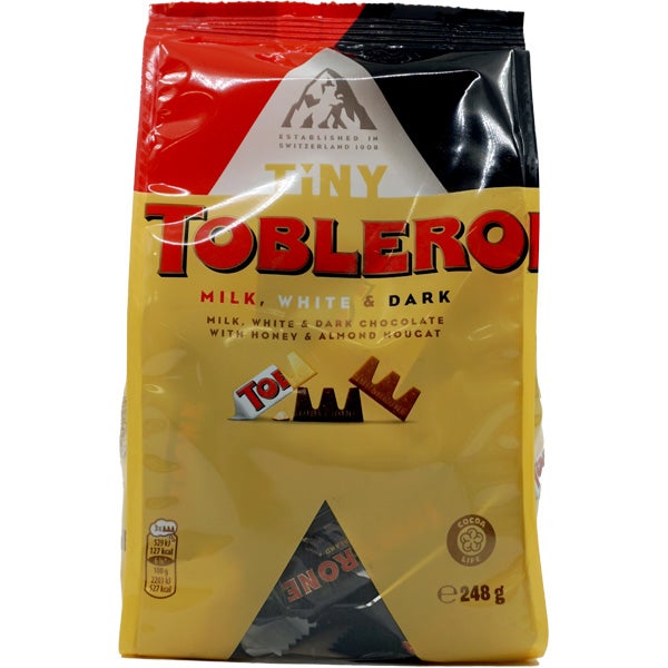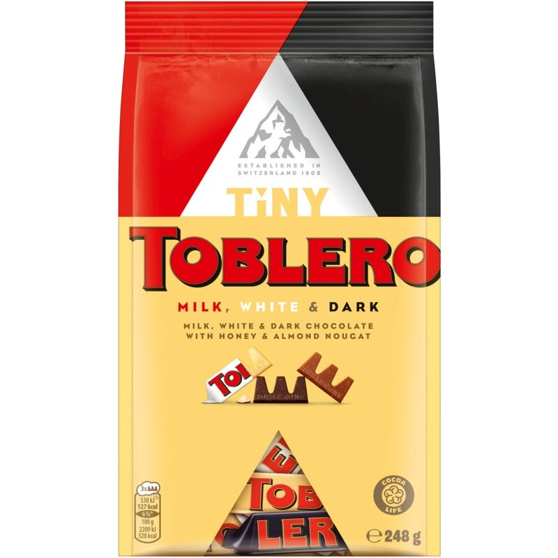 Toblerone Tiny is een heerlijke traktatie die de unieke smaak van Toblerone chocolade biedt in schattige, kleine porties. Deze miniatuurversies van de klassieke Toblerone bevatten de bekende combinatie van Zwitserse melkchocolade, nougat, amandelen en honing, maar dan in een formaat dat perfect is voor het delen of als kleine snack